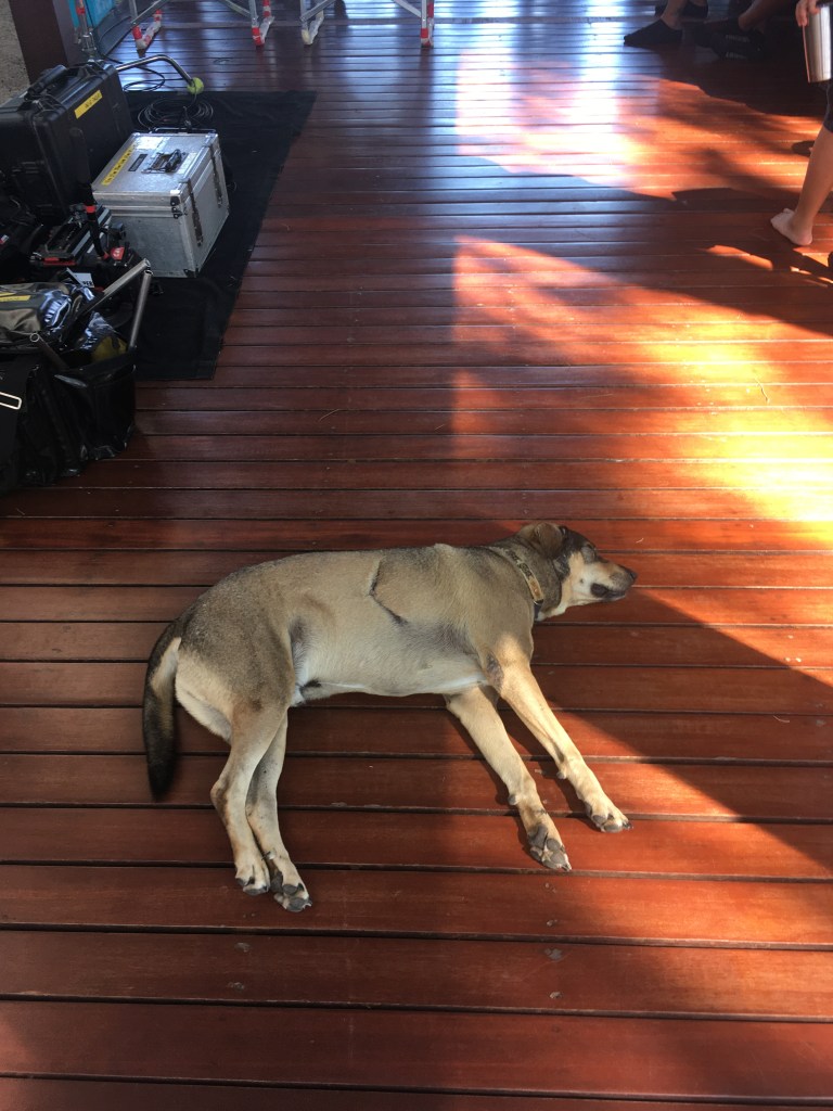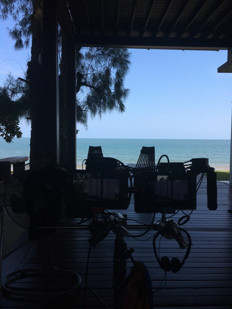 Monday. I woke up still on the FaceTime call with the bf from the night before. Rushed to get dressed as I felt like I overslept in my glorious comfy bed and was greeted by one of the warmest sunrises once I was out of the door. That’s mornings like these which make it so easy to appreciate the job I do. We spent the day filming in this nice modern house by the beach. Funny enough the first scene was meant to be set in New York, so all the massive glass windows overlooking the beach were covered with green screen where skyscrapers will be added in post. However the rest of the scenes were taking advantage of the beautiful scenery. It was a great day. On my lunch I was just chilling in one of the hammocky chairs overlooking the sea and daydreaming about my time in Indonesia this winter. In the evening we had work dinner for one of the actresses who was about to wrap on the show the next day. Meal was lovely and conversations fun. Change of location really did good for the crew. I also got a present from the lighting guys – one of their yellow crew t-shirts. Was super pleased.